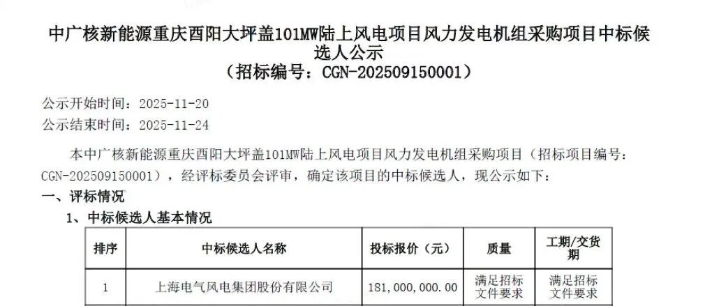 近日,中广核新能源重庆酉阳大坪盖101MW陆上风电项目风力发电机组采购项目公开招标结果公告,显示电气风电成功中标,将为其提供陆上卓越平台机组,双方在风电领域的合作得以持续拓展与加深。电气风电与中广核集团已有十余年的合作历史,有着深厚的合作基...