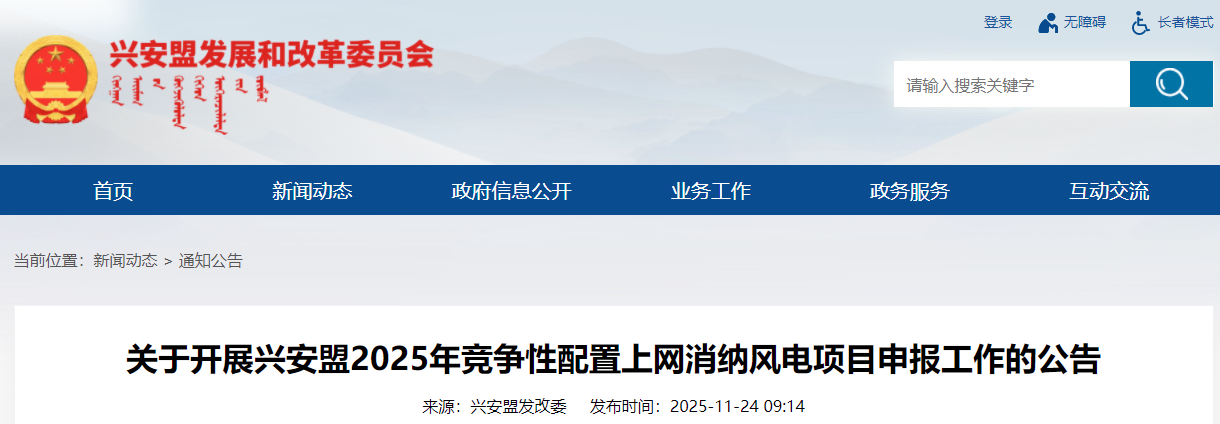 近日,内蒙古兴安盟发布《关于开展兴安盟2025年竞争性配置上网消纳风电项目申报工作的公告》,规模为90万千瓦。原文如下:根据《内蒙古自治区能源局关于开展2025年上网消纳风电项目竞争性配置的通知》(内能源新能字〔2025〕654号)及《内蒙...