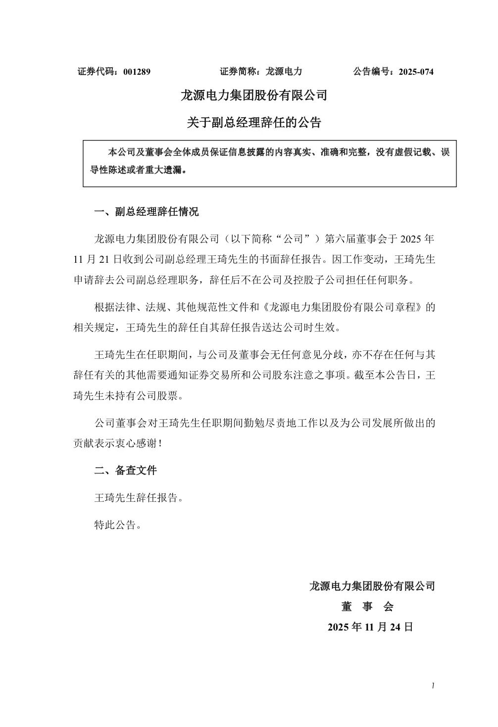 11月24日晚间,龙源电力发布公告称,公司第六届董事会于2025年11月21日收到公司副总经理王琦先生的书面辞任报告。因工作变动,王琦先生申请辞去公司副总经理职务,辞任后不在公司及控股子公司担任任何职务。...