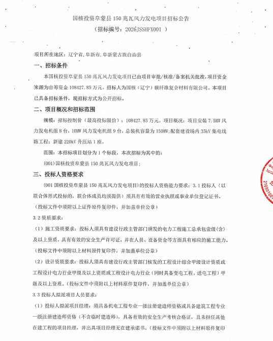 3月17日,国核投资阜蒙县150兆瓦风力发电项目招标公告,公告显示,本国核投资阜蒙县150兆瓦风力发电项目已由项目审批/核准/备案机关批准,项目资金来源为自筹资108427.85万元。招标人为国核(辽宁)碳纤维复合材料有限公司。本项目已具备...