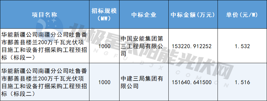 11月25日,中国华能电子商务平台发布华能新疆公司南疆分公司吐鲁番市鄯善县楼兰200万千瓦光伏项目施工和设备打捆采购工程预招标中标结果公示,中标人分别为中国安能集团第三工程局有限公司、中建三局集团有限公司,单价分别为1.532元/W、1.5...