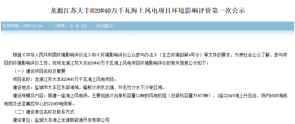 北极星风力发电网获悉,11月24日,江苏环保公众网发布《龙源江苏大丰H20#40万千瓦海上风电项目环境影响评价第一次公示》。《公示》显示,该项目位于盐城市大丰区东部海域。建设规模及内容:新建一座海上风电场,主要包括37台单机容量11MW的风...