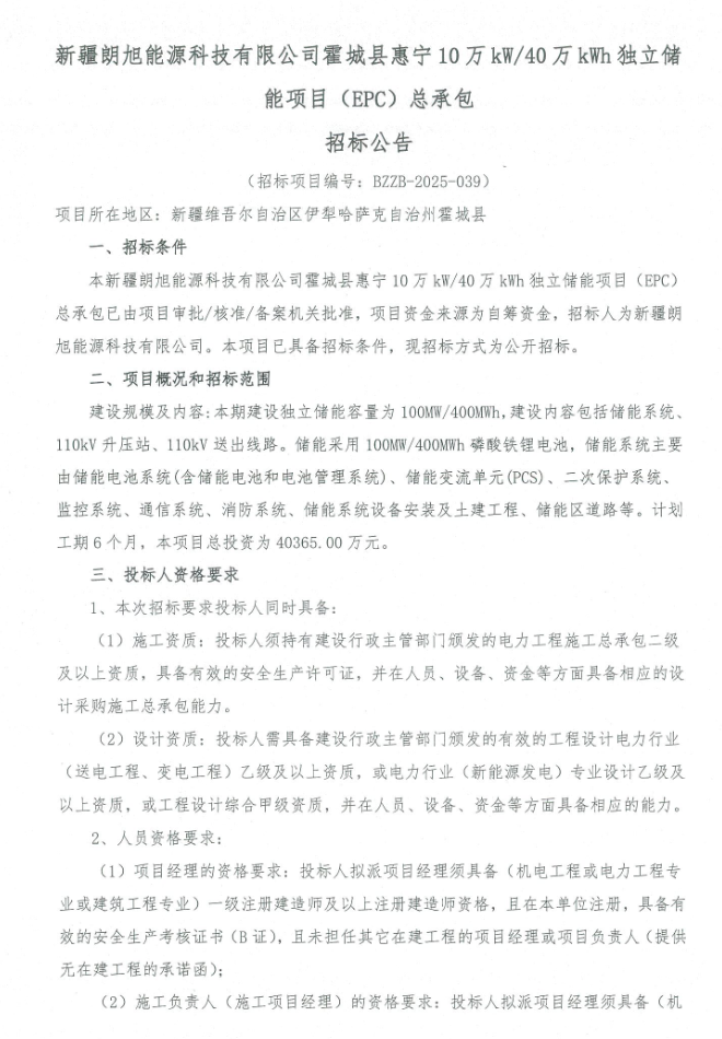 11月21日,新疆朗旭能源科技有限公司霍城县惠宁10万kW/40万kWh独立储能项目(EPC)总承包招标公告发布,项目招标人为新疆朗旭能源科技有限公司,项目位于新疆维吾尔自治区伊犁哈萨克自治州霍城县,本期建设独立储能容量为100MW/400...