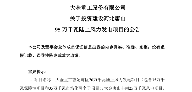 北极星风力发电网获悉,11月22日,大金重工股份有限公司(以下简称“大金重工”或“公司”)发布《关于投资建设河北唐山95万千瓦陆上风力发电项目的公告》。公告披露,大金重工于2025年11月21日召开了第五届董事会第二十三次会议,审议通过了《...