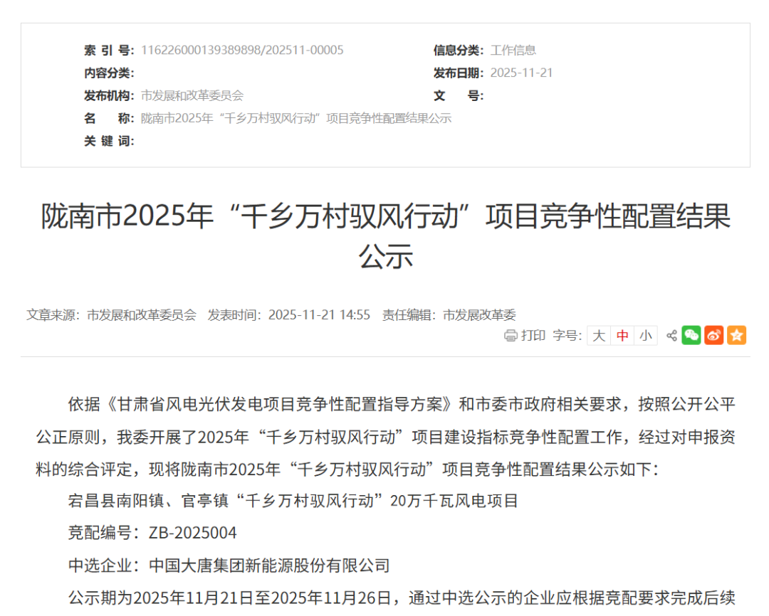 北极星风力发电网获悉,11月21日,甘肃省陇南市2025年“千乡万村驭风行动”项目竞争性配置结果公示。根据公示,宕昌县南阳镇、官亭镇“千乡万村驭风行动”20万千瓦风电项目中选企业为中国大唐集团新能源股份有限公司。竞配公告显示,宕昌县南阳镇、...