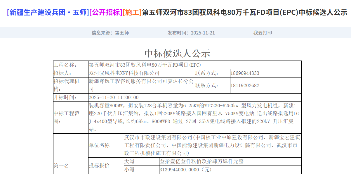 北极星风力发电网获悉,11月21日,新疆生产建设兵团公共资源电子招投标交易平台发布《第五师双河市83团驭风科电80万千瓦FD项目(EPC)中标候选人公示》的公告。公告显示,第一中标候选人:武汉市市政建设集团有限公司(中国核工业中原建设有限公...