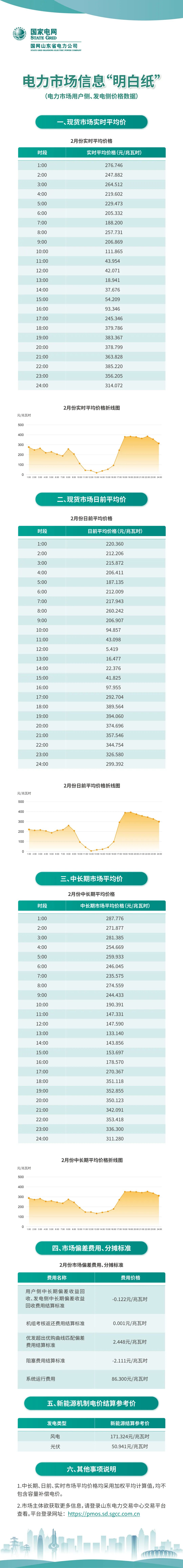 近日,国网山东发布2026年2月电力市场信息“明白纸”,包含现货市场实时平均价格(24时点)、现货市场日前平均价格(24时点),中长期市场平均价格(24时点),市场偏差费用、分摊标准,新能源机制电价结算参考价。2026年2月,现货市场实时平...