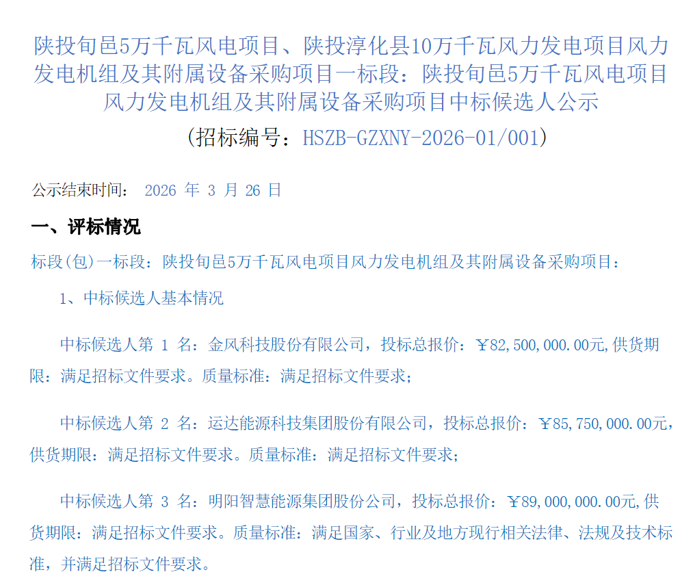 3月23日,陕投旬邑5万千瓦风电项目、陕投淳化县10万千瓦风力发电项目风力发电机组及其附属设备采购项目中标候选人公示,规模共计150MW。其中:金风科技预中标50MW,投标报价0.825亿元,折合单价1650元/kW。运达股份预中标100M...