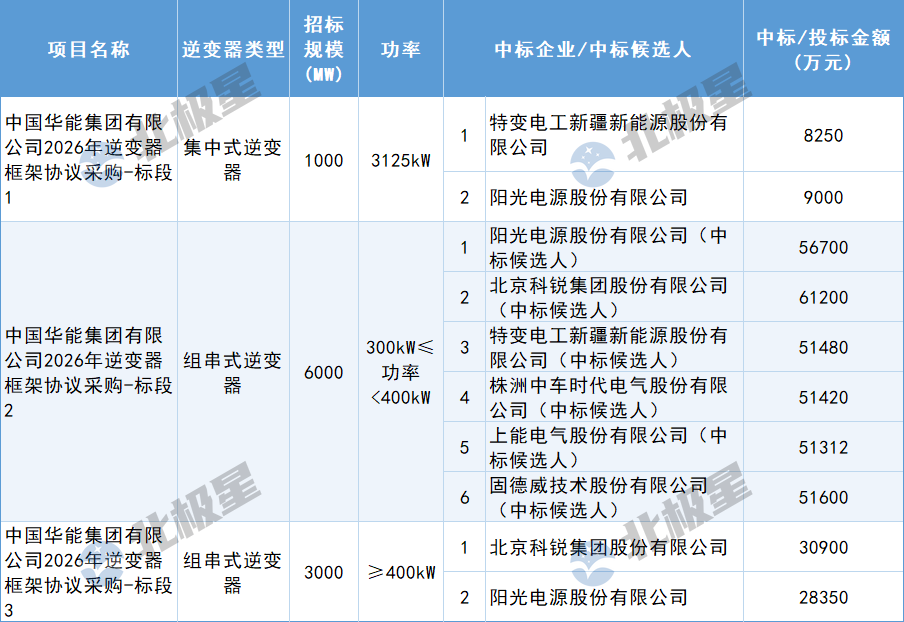 3月18日,华能集团2026年逆变器框架协议采购招标(标段二)中标候选人公示,入围企业有阳光电源股份有限公司、北京科锐集团股份有限公司、特变电工新疆新能源股份有限公司、株洲中车时代电气股份有限公司、上能电气股份有限公司、固德威技术股份有限公...