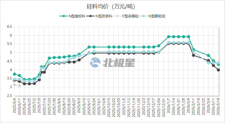 3月18日,硅业分会发布最新硅料价格,本周n型复投料、致密料价格持续下跌。其中,多晶硅n型复投料成交价格区间为4.2-4.5万元/吨,成交均价为4.32万元/吨,环比下滑4.42%;n型颗粒硅成交价格区间为4.3-4.5万元/吨,成交均价维...