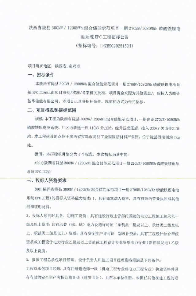 11月20日,陕西省陇县300MW/1200MWh混合储能示范项目一期270MW/1080MWh磷酸铁锂电池系统EPC工程招标公告。项目招标人为陇县智华储能有限公司,本工程为陕西省陇县300MW/1200MWh混合储能示范项目,一期建设27...