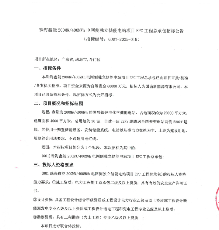 11月22日,珠海鑫能200MW/400MWh电网侧独立储能电站项目EPC工程总承包招标公告发布。该项目位于广东省珠海市斗门区,由国谕新能源有限公司作为招标人,项目资金来源为自筹资金60000万元。项目规划建设容量为200MW/400MWh...