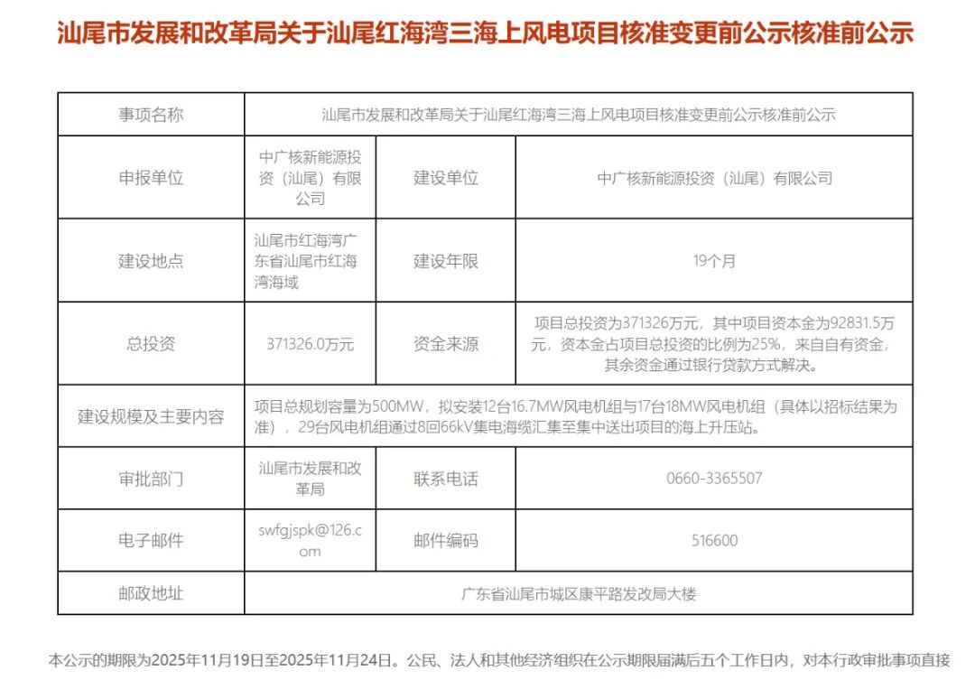 11月19日,汕尾市发展和改革局发布《关于汕尾红海湾三海上风电项目核准变更前公示核准前公示》。根据公示,汕尾红海湾三海上风电项目建设地点位于汕尾市红海湾广东省汕尾市红海湾海域,项目总规划容量为500MW,拟安装12台16.7MW风电机组与1...
