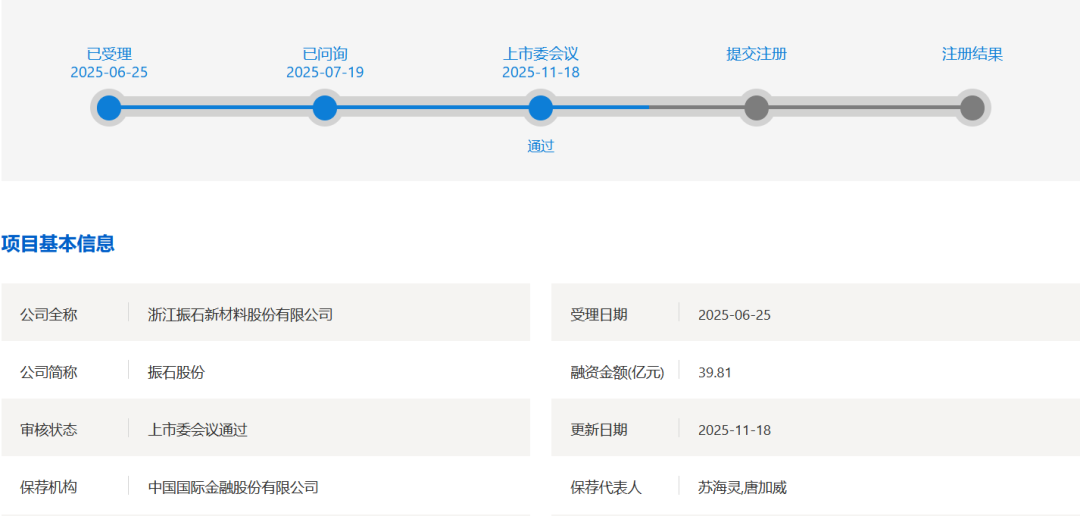 2025年11月18日,上交所官网公告,浙江振石新材料股份有限公司(简称“振石股份”)沪主板IPO项目获得上市委审议通过。振石股份IPO于2025年6月25日获受理,7月19日进入问询阶段,11月18日上会,审核周期仅5个月,体现审核提速。...