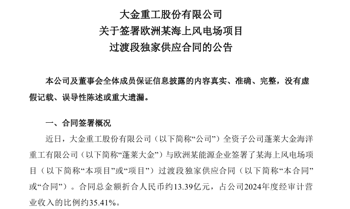 北极星风力发电网获悉,11月22日,大金重工股份有限公司(以下简称“大金重工”或“公司”)发布《关于签署欧洲某海上风电场项目过渡段独家供应合同的公告》。公告披露,近日,大金重工全资子公司蓬莱大金海洋重工有限公司(以下简称“蓬莱大金”)与欧洲...
