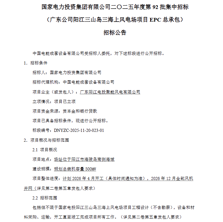 北极星风力发电网获悉,11月20日,国家电投发布《国家电力投资集团有限公司二〇二五年度第92批集中招标(广东公司阳江三山岛三海上风电场项目EPC总承包)招标公告》。《公告》显示,阳江三山岛三海上风电场项目位于广东省阳江市海陵岛南侧海域,规划...