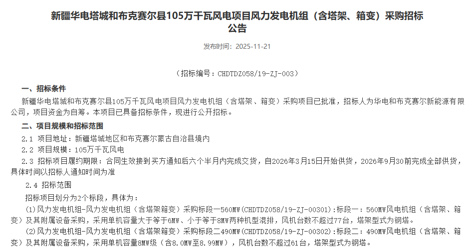 北极星风力发电网获悉,11月21日,华电集团发布《新疆华电塔城和布克赛尔县105万千瓦风电项目风力发电机组(含塔架、箱变)采购招标公告》。《公告》显示,该项目位于新疆塔城地区和布克赛尔蒙古自治县境内,项目规模105万千瓦风电。本次招标划分为...