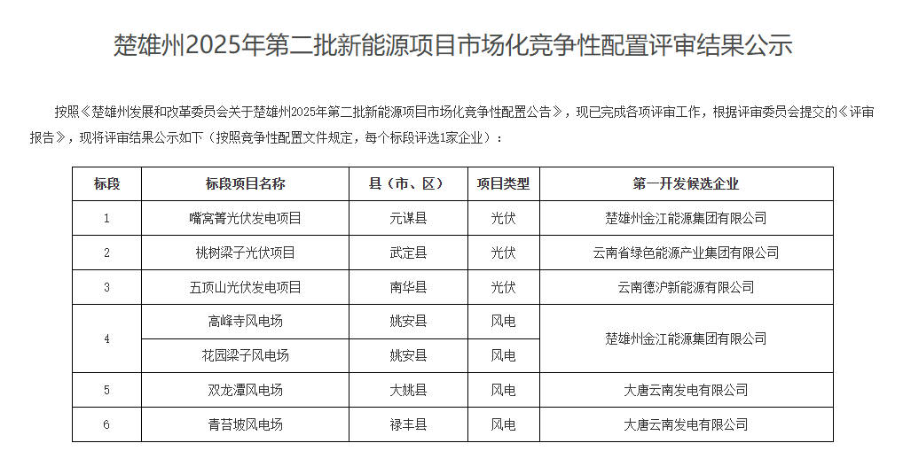 北极星风力发电网获悉,11月19日,云南省楚雄州2025年第二批新能源项目市场化竞争性配置评审结果公示。根据公示,金江能源集团、大唐、云南能投、云南德沪新能源4家企业拟获得指标。10月31日,云南省楚雄州2025年第二批新能源项目竞争性配置...