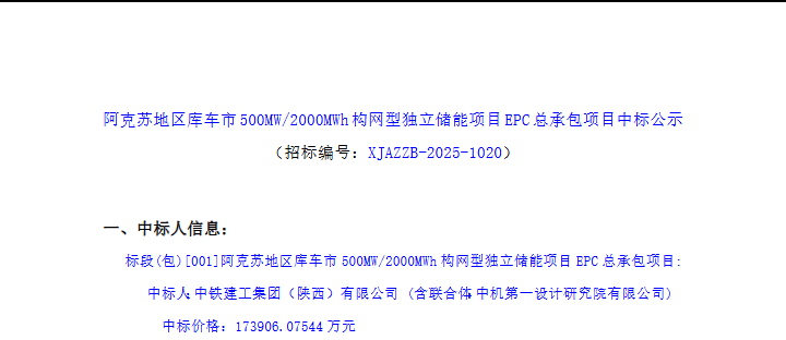 11月17日,阿克苏地区库车市500MW/2000MWh构网型独立储能项目EPC总承包中标公示发布,中铁建工集团(陕西)有限公司(联合体含中机第一设计研究院有限公司)成功中标,中标价格约17.39亿元。据了解,该项目位于新疆阿克苏地区库车县...