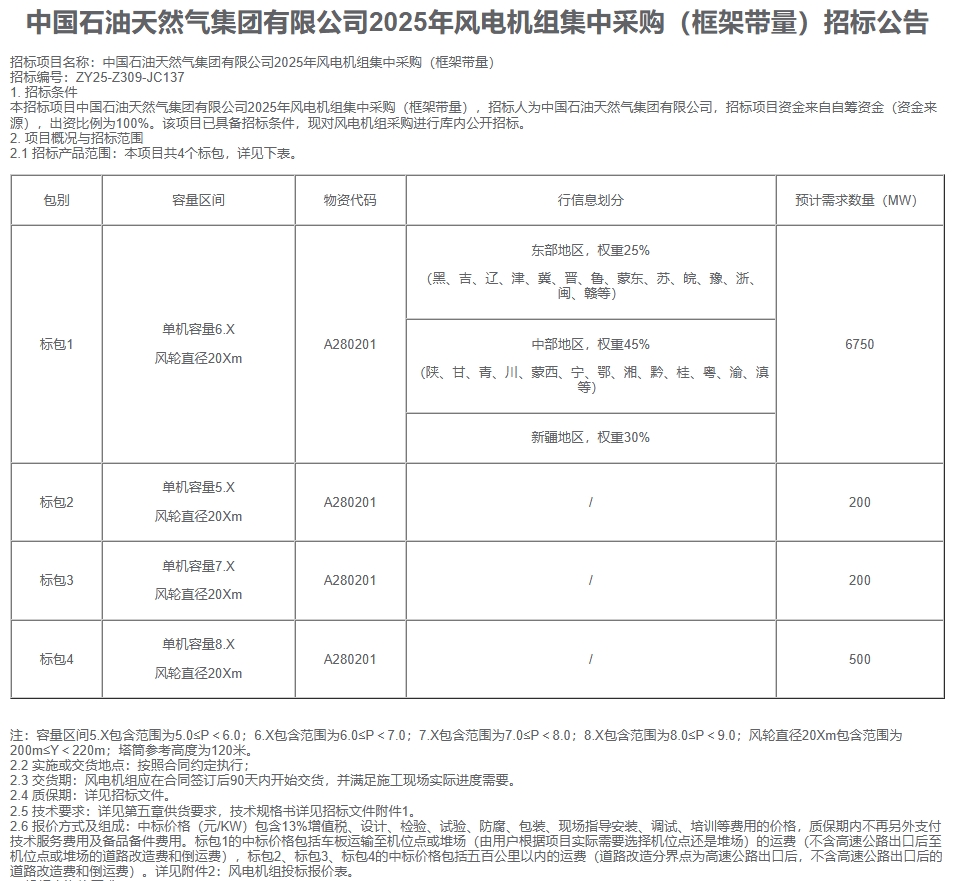 北极星风力发电网获悉,11月14日,中石油2025年风电机组集中采购(框架带量)招标公告发布。根据招标公告显示,项目容量区间5.X包含范围为5.0≤P<6.0;6.X包含范围为6.0≤P<7.0;7.X包含范围为7.0≤P<8.0;8.X包...