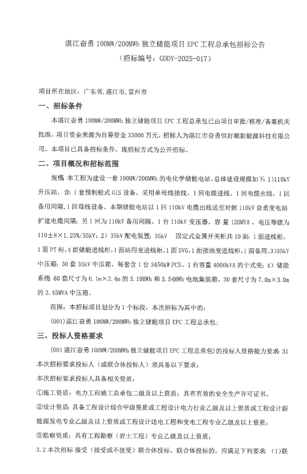 11月14日,湛江市奋勇恒好顺新能源科技有限公司发布湛江奋勇100MW/200MWh独立储能项目EPC工程总承包招标公告。项目位于广东省湛江市雷州市,建设一套100MW/200MWh的电化学储能电站。项目资金来源为自筹资金33000万元,折...