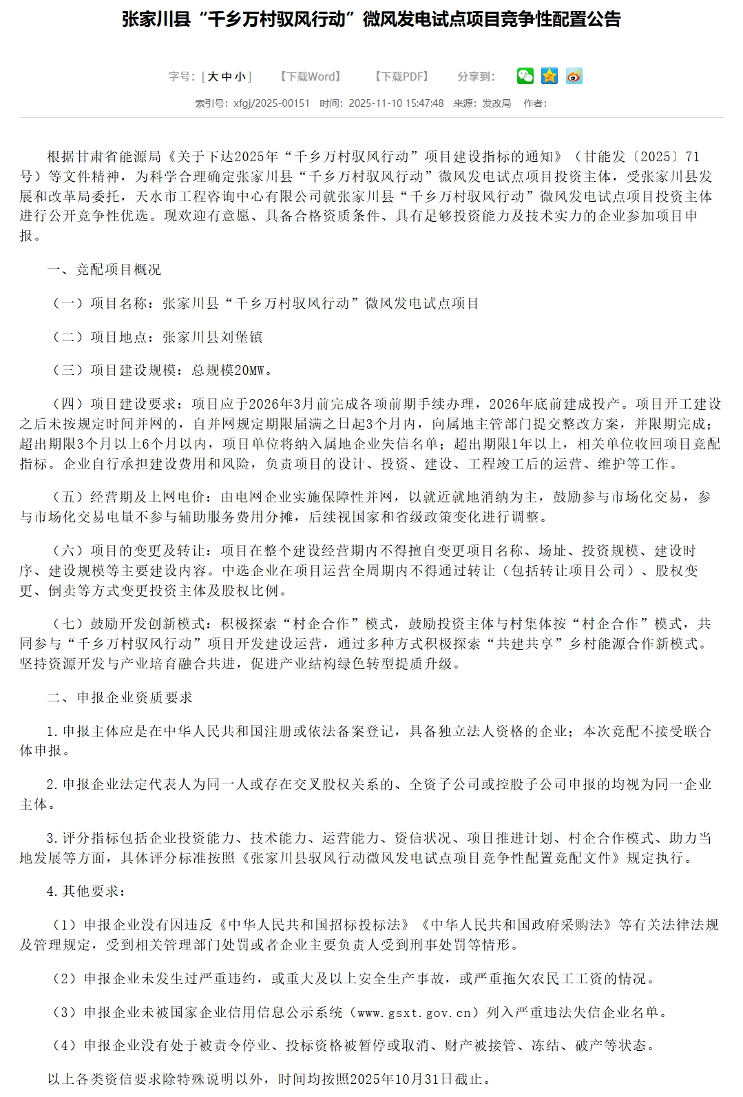 北极星风力发电网获悉,日前,甘肃两地启动驭风项目竞配。11月10日,天水市张家川县“千乡万村驭风行动”微风发电试点项目竞争性配置公告发布。根据公告,张家川县“千乡万村驭风行动”微风发电试点项目位于张家川县刘堡镇,项目规模20MW。公告要求,项目应于2026年3月前完成各项前期手续办理,2026年底前建成投产。项目开工建设之后未按规定时间并网的,自并网规定期限...