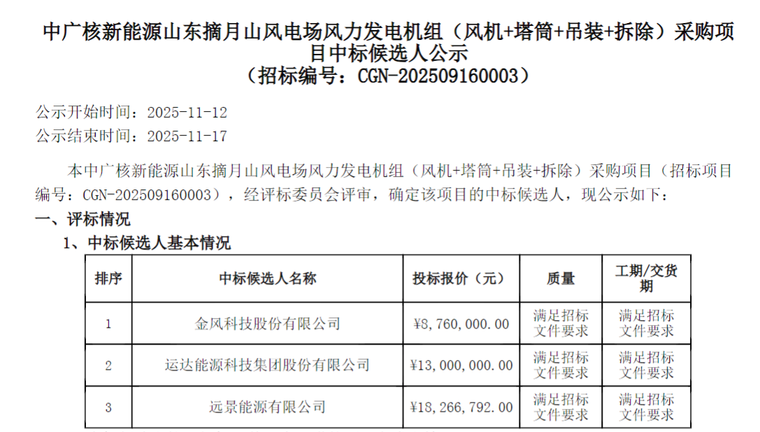 11月13日,中广核新能源山东摘月山风电场风力发电机组(风机+塔筒+吊装+拆除)采购项目中标候选人公示,金风科技为第一中标候选人,投标报价876万元。项目规模:中广核摘月山风电场位于安丘市西南部温泉乡以南。总装机容量为98.6MW,分两期建...