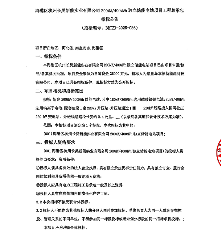 11月13日,海港区杭州长昊新能实业有限公司200MW/400MWh独立储能电站项目工程总承包招标公告发布,项目落地河北省秦皇岛市海港区,总投资3.6亿元,资金来源为自筹,招标人为秦皇岛本拓新能源科技有限公司,招标方式为公开招标。该项目规划...