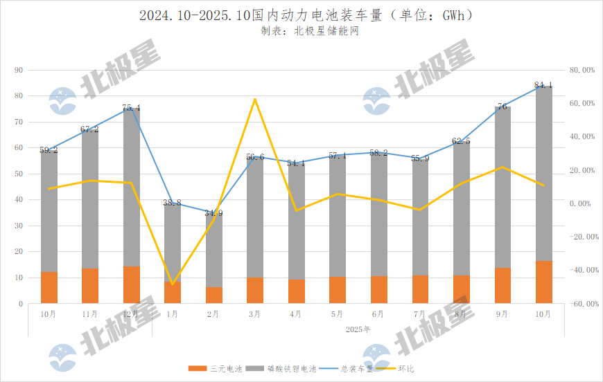 北极星储能网获悉,11月12日,中国汽车动力电池产业创新联盟发布2025年10月动力电池月度信息。10月,国内动力电池装车量84.1GWh,环比增长10.7%,同比增长42.1%。其中三元电池装车量16.5GWh,占总装车量19.7%,环比...