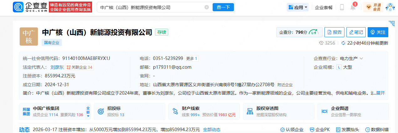 北极星储能网获悉,中广核在山西新能源布局迎来重磅加码。天眼查显示,3月16日,中广核(山西)新能源投资有限公司(简称“中广核山西公司”)注册资本由5000万元大幅提升至约85.60亿元,增幅高达17020%,引发行业关注。此次增资构成多元,...
