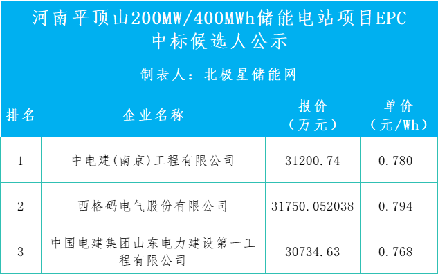 北极星储能网获悉,11月11日,启赫新能源河南宝丰200MW/400MW储能电站项目EPC总承包中标候选人公示。第一中标候选人为中电建(南京)工程有限公司,投标报价31200.74万元,折合单价0.780元/Wh;第二中标候选人为西格码电气...