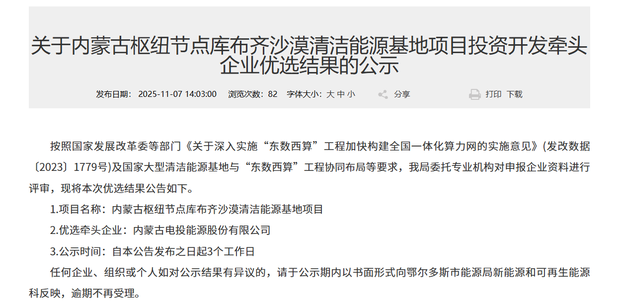 北极星风力发电网获悉,近日,鄂尔多斯能源局发布《关于内蒙古枢纽节点库布齐沙漠清洁能源基地项目投资开发牵头企业优选结果的公示》。公示显示,内蒙古枢纽节点库布齐沙漠清洁能源基地项目优选牵头企业为内蒙古电投能源股份有限公司。根据企查查,该企业为上...