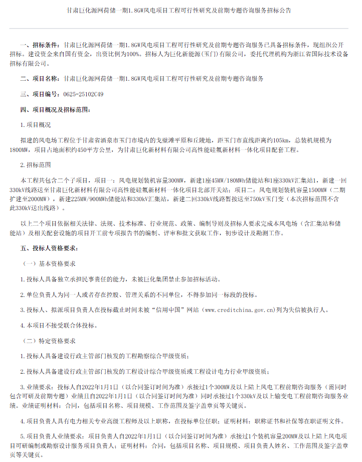 北极星风力发电网获悉,近日,甘肃巨化源网荷储一期1.8GW风电项目工程可行性研究及前期专题咨询服务启动招标。据悉,拟建的风电场工程位于甘肃省酒泉市玉门市境内的戈壁滩平原和丘陵地,距玉门市直线距离约105km,总装机规模为1800MW,项目占...