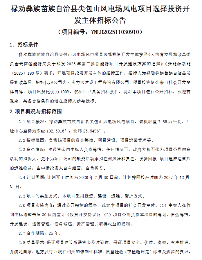 北极星风力发电网获悉,近日,云南昆明禄劝彝族苗族自治县尖包山风电场风电项目选择投资开发主体招标公告发布。根据招标公告,禄劝彝族苗族自治县尖包山风电场风电项目,装机容量7.85万千瓦,是云南2025年第二批新能源项目开发建设方案中项目。本次招...