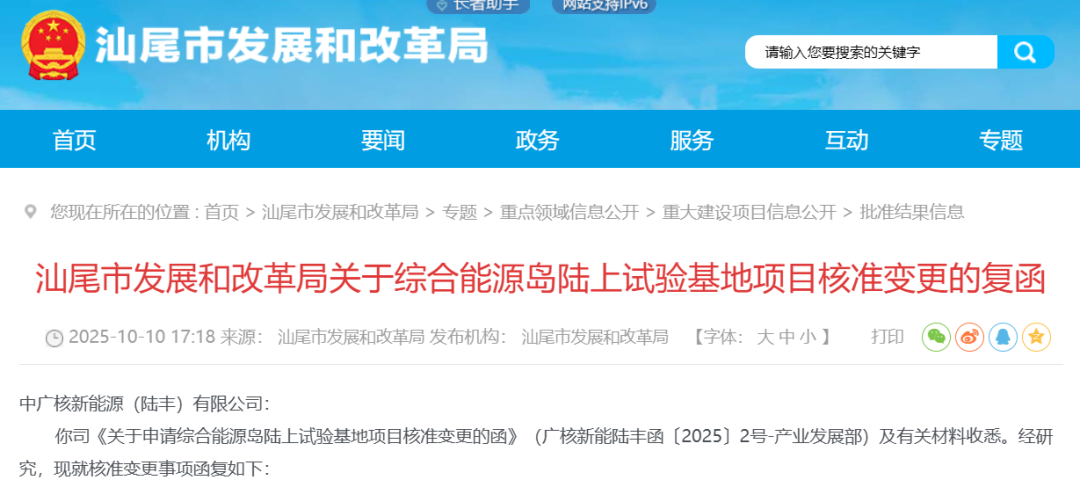 北极星风力发电网获悉,近日,汕尾市发展和改革局发布《关于综合能源岛陆上试验基地项目核准变更的复函》。文件显示,综合能源岛陆上试验基地项目于2025年3月31日取得汕尾市发展和改革局核准批复,批复文件为《汕尾市发展和改革局关于综合能源岛陆上试...