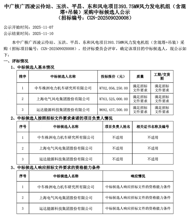 北极星风力发电网获悉,近日,中广核广西凌云伶站、玉洪、平昌、东和风电项目393.75MW风力发电机组(含混塔+吊装)采购开标:中车株洲所为第一中标候选人,报价7.02亿元,合1783元/千瓦。项目规模:(1)凌云伶站风电场位于广西百色市凌云...