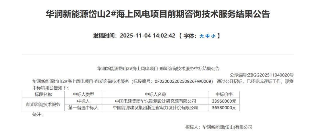 近日,华润集团守正采购交易平台发布《华润新能源岱山2#海上风电项目前期咨询技术服务结果公告》。公告显示,中标人:中国电建集团华东勘测设计研究院有限公司,中标价格:3396万元。第一备选中标人:中国能源建设集团浙江省电力设计院有限公司,中标价...