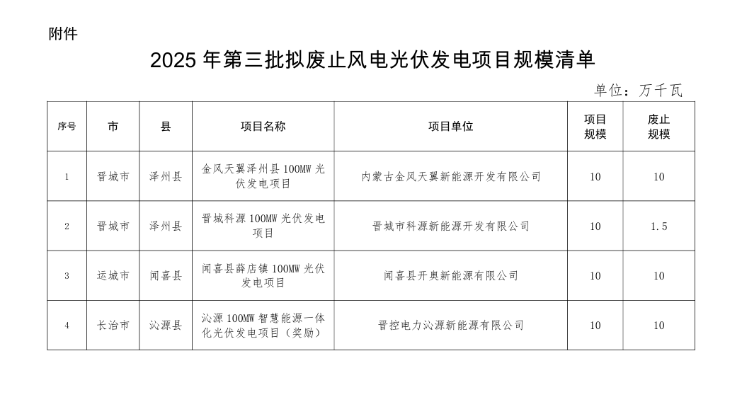 北极星风力发电网获悉,11月7日,山西省能源局发布《关于2025年第三批拟废止风电光伏发电规模清单的公示》,《公示》显示,山西省2025年第三批废止的8个风光项目,其中包含一个4万千瓦的风电项目,废止规模为1万千瓦。山西省能源局关于2025...