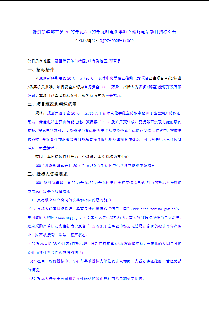 2025年11月,源湃(新疆)能源开发有限公司就“源湃新疆鄯善县20万千瓦/80万千瓦时电化学独立储能电站项目”发布公开招标公告。该项目位于新疆吐鲁番地区鄯善县,规划建设1座20万千瓦/80万千瓦时电化学独立储能电站和1座220kV储能汇集...