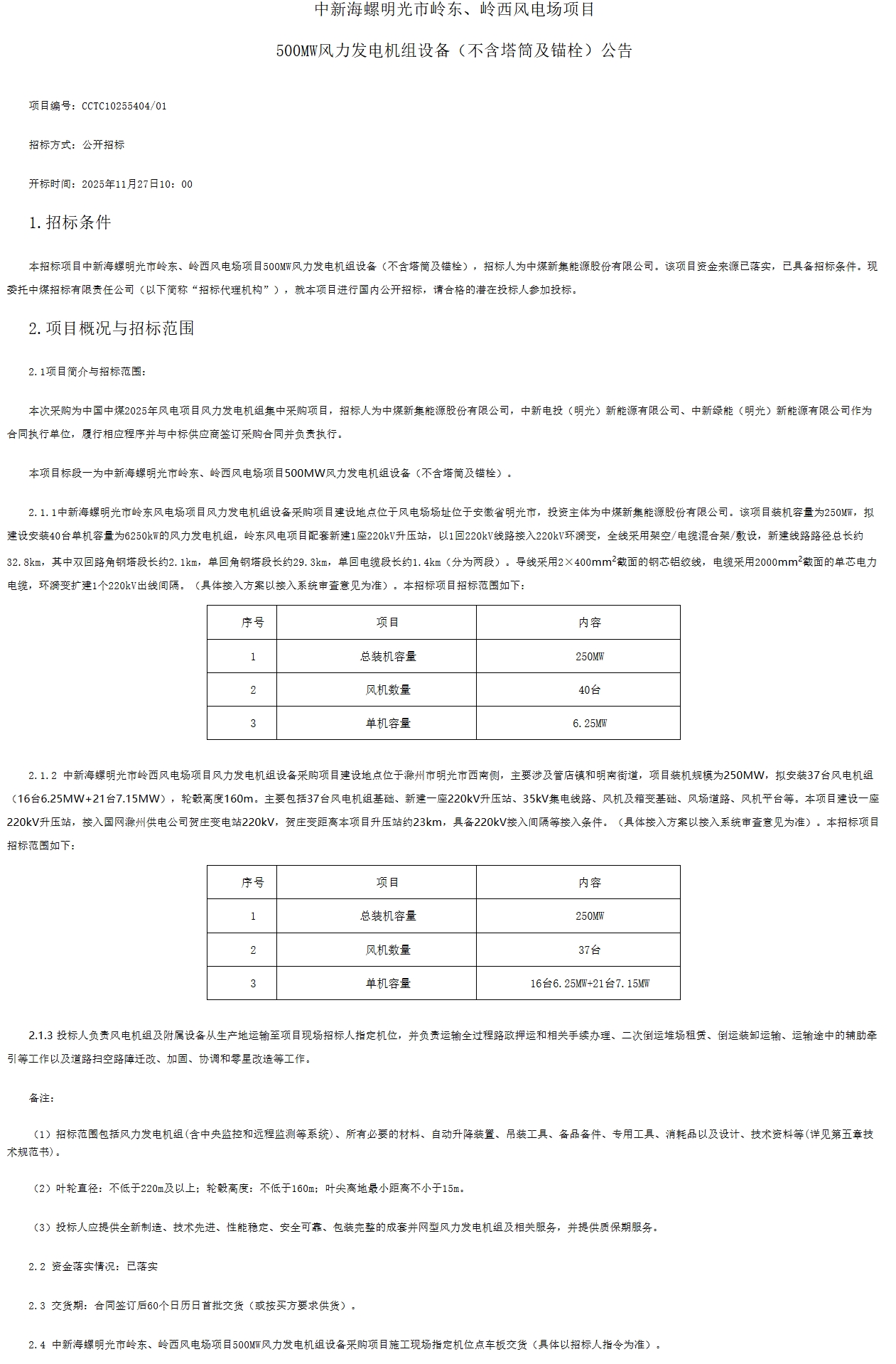北极星风力发电网获悉,近日,中煤集团发布《中国中煤2025年风电项目风力发电机组集中采购项目项目公告》。其中包含《中新海螺明光市岭东、岭西风电场项目500MW风力发电机组设备(不含塔筒及锚栓)》《中煤锡林郭勒盟芒来发电有限公司全额自发自用8...