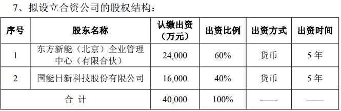 北极星储能网获悉,11月5日晚,国能日新公告称,拟与东方新能共同出资4亿元成立合资储能公司,注册地暂定为北京市。国能日新表示,基于公司发展战略规划及资产运营业务领域的布局,拟与东方新能(北京)企业管理中心(有限合伙)签订《投资合作协议》,双...
