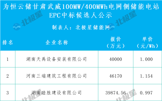北极星储能网获悉,11月5日,为恒云储凉州区100MW/400MWh电网侧储能电站示范项目EPC总承包中标候选人公示。第一中标候选人为湖南天禹设备安装有限公司,投标报价40000万元,折合单价1元/Wh;第二中标候选人为河南三端建筑工程有限...