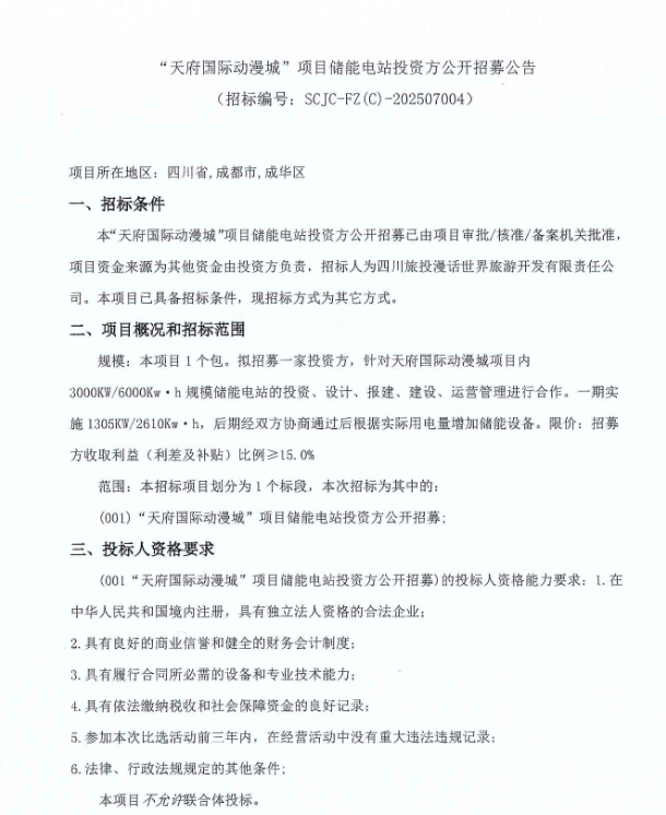 11月4日,四川旅投漫话世界旅游开发有限责任公司发布“天府国际动漫城”项目储能电站投资方公开招募公告。本项目1个包,拟招募一家投资方,针对天府国际动漫城项目内3000kW/6000kW·h规模储能电站的投资、设计、报建、建设、运营管理进行合...
