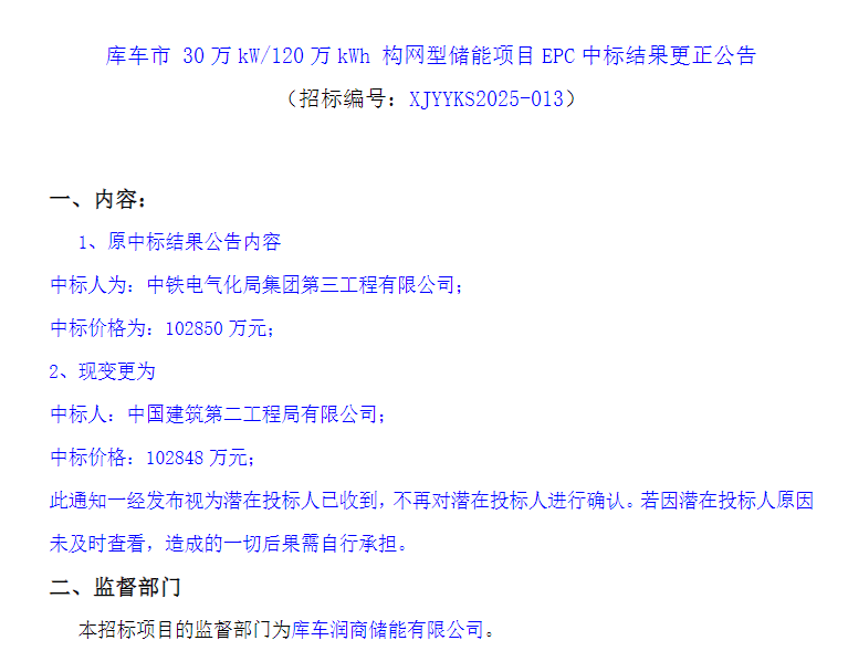 北极星储能网讯:2026年1月8日,库车市300MW/1.2GWh构网型储能项目EPC中标结果更正公告。原中标人为中铁电气化局集团第三工程有限公司,中标价格为102850万元,现变更中标人为中国建筑第二工程局有限公司,中标价格为102848...