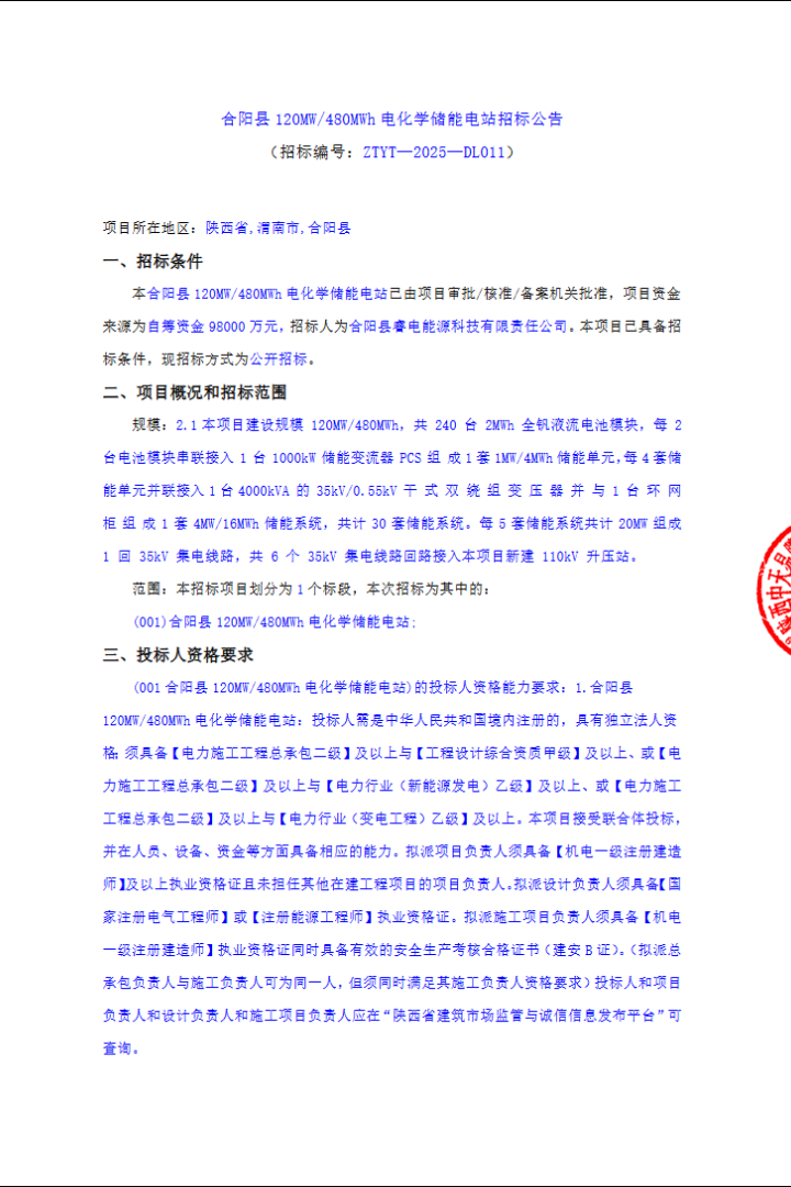 10月31日,合阳县睿电能源科技有限责任公司发布“合阳县120MW/480MWh电化学储能电站招标公告”,资金来源为自筹,估算总投资9.8亿元,相当于单价约2元/Wh。公告显示,项目建设规模达120MW/480MWh,将配置240台2MWh...