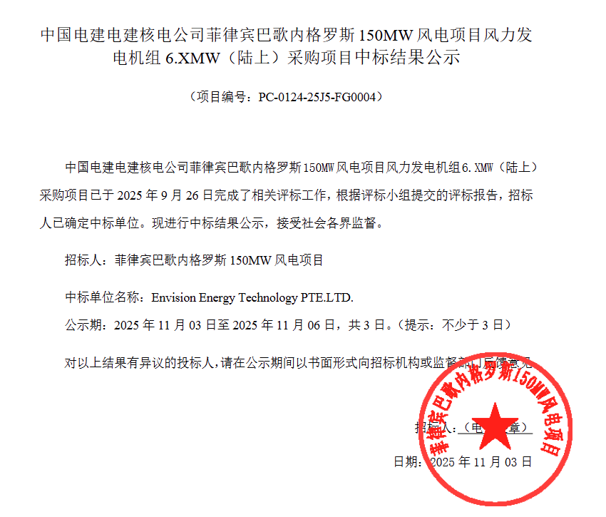 北极星风力发电网获悉,11月3日,中国电建电建核电公司菲律宾巴歌内格罗斯150MW风电项目风力发电机组6.XMW(陆上)采购项目中标结果揭晓:远景能源中标。据悉,该项目总装机150MW,远景能源此前报价为5.13亿元,合3420元/kW。...