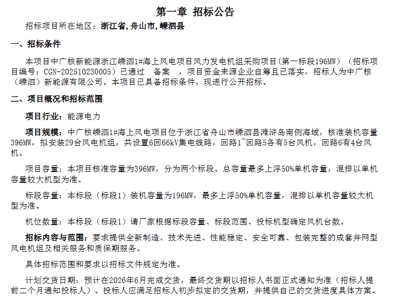 北极星风力发电网获悉,11月4日,中广核发布《中广核新能源浙江嵊泗1#海上风电项目风力发电机组采购项目》招标公告。公告显示,本次招标总容量为396MW,分为两个标段。标段一:装机容量为196MW,最多上浮50%单机容量,混排以单机容量较大机...