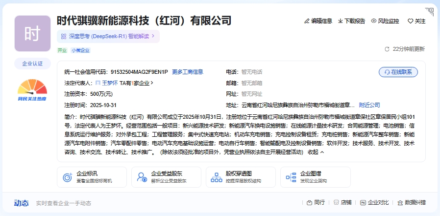 爱企查显示,2025年10月31日,时代骐骥新能源科技(红河)有限公司正式成立,注册资本500万元,法人为王梦怀。该公司由时代骐骥绿能科技(昆明)有限公司100%控股(该公司为宁德时代间接持股公司)。公司注册于云南红河,业务覆盖新能源汽车换...