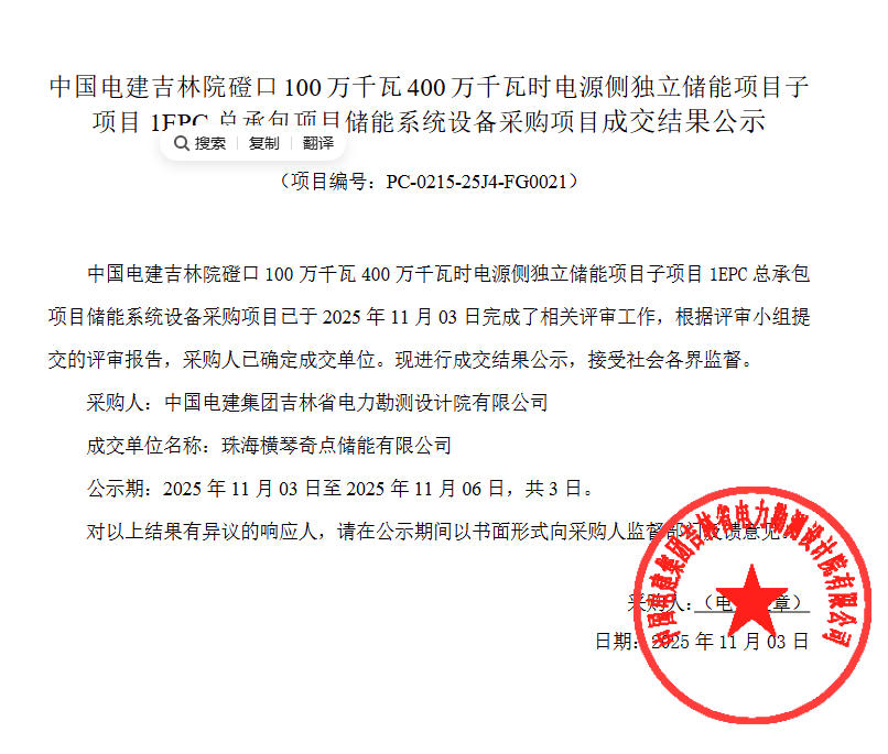 北极星储能网获悉,11月3日,中国电建吉林院磴口100万千瓦400万千瓦时电源侧独立储能项目子项目1EPC总承包项目储能系统设备采购项目成交结果公示。奇点能源全资子公司珠海横琴奇点储能有限公司中标该项目。磴口100万千瓦/400万千瓦时电源...