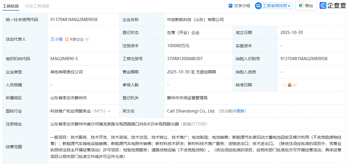 北极星储能网获悉,10月30日,中创新航科技(山东)有限公司注册成立,法定代表人为王小强,注册资本10亿元,企业注册地址位于山东省枣庄市滕州市南沙河镇,所属行业为科技推广和应用服务业,经营范围包含:电池制造;电池销售;新能源汽车废旧动力蓄电...